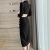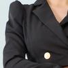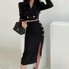Nothing exudes modern elegance like this crop top blazer style top in sleek black with pointed overlapping lapels, puffed long sleeves, and gold disc accents. The matching midi pencil skirt is high-waisted, baring only a little midriff and falls below the knee with a side split. The same muted gold disc embellishments complete the garment, adding a touch of sophistication.